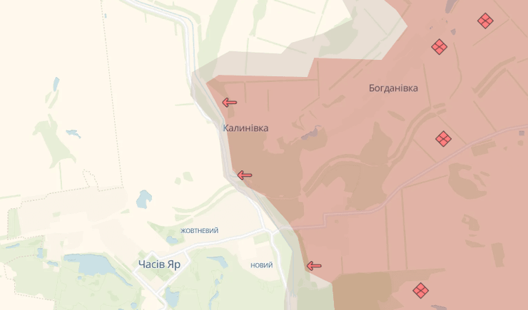 Російські війська просунулися в селищі Калинівка Часовоярської міської громади Бахмутському районі Донецької області. Про це повідомляють аналітики Deep State.