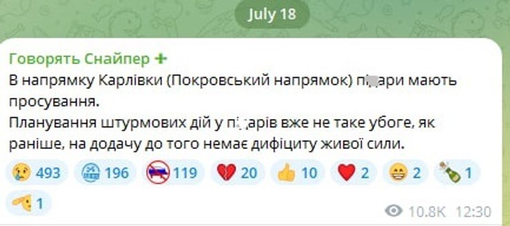 "В напрямку Карлівки (Покровський напрямок) п**ари мають просування. Планування штурмових дій у п**арів вже не таке убоге, як раніше, на додачу до того немає дефіциту живої сили", — проінформував він.