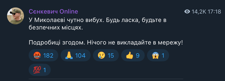 О 17:18 Сєнкевич зауважив, що в Миколаєві пролунав вибух.