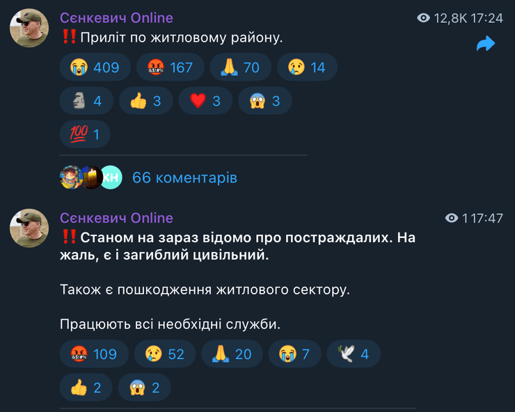 "Відомо про постраждалих. На жаль, є і загиблий цивільний", — сказав Олександр Сєнкевич.
