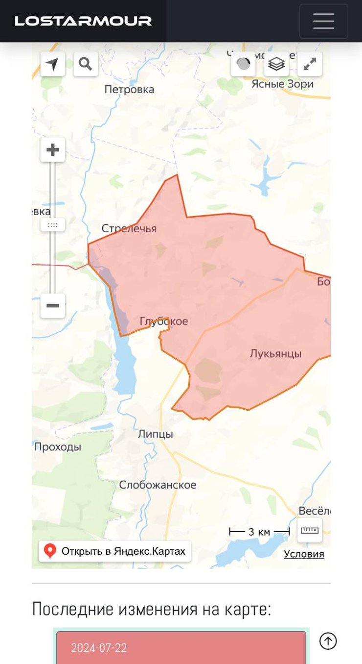"За заявами росіян та візуальними ознаками, українські війська знову були витіснені з селища Глибоке на Харківщині", — зазначив журналіст.