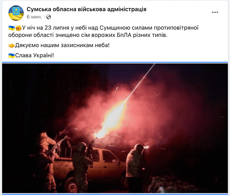 "У ніч на 23 липня у небі над Сумщиною силами протиповітряної оборони області знищено сім ворожих БпЛА різних типів", — додали в повідомленні.