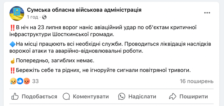 "В ніч на 23 липня ворог здійснив авіаційний удар по об'єктах критичної інфраструктури Шосткинської громади. На місці працюють всі необхідні служби. Триває ліквідація наслідків ворожої атаки та аварійно-відновлювальні роботи", — йдеться у повідомленні.