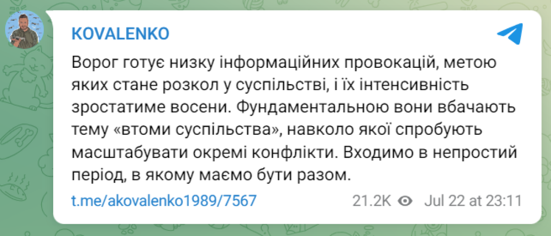 Керівник Центру протидії дезінформації Андрій Коваленко заявив, що ворог планує використати тему "втоми суспільства" для розколу.