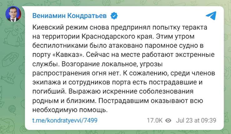 У Краснодарському краї БпЛА атакували поромне судно в порту "Кавказ". Про це повідомив губернатор регіону Веніамін Кондратьєв у вівторок вранці, 23 липня.