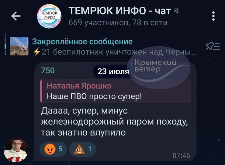 "Мінус залізничний пором, походу, так знатно влупило", — написав один із коментаторів, який обурений коментарями про "супер роботу" російської ППО.