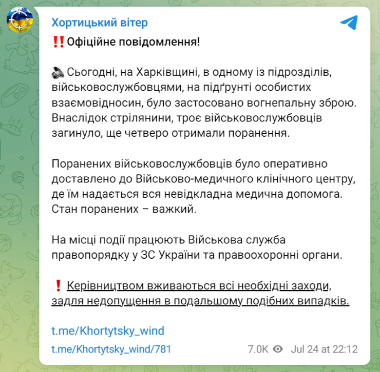 У середу, 24 липня, в одному із підрозділів у Харківській області сталася стрілянина між військовослужбовцями. Троє військових загинули, ще четверо дістали поранення. Про це повідомила пресслужба оперативно-стратегічного угруповання військ "Хортиця".