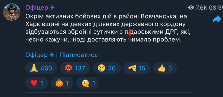 На деяких ділянках державного кордону в Харківській області відбуваються збройні сутички українських військових з російськими диверсійно-розвідувальними групами. Про це повідомив лейтенант ЗСУ з позивним "Алекс" у своєму Telegram-каналі.