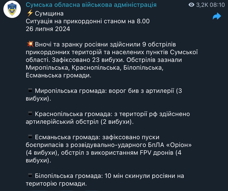 У Сумській ОВА розповіли, що вночі та вранці 26 липня окупанти здійснили девʼять обстрілів прикордонних територій і населених пунктів, було зафіксовано 23 вибухи. Зокрема, під обстрілами опинилися Миропільська, Краснопільська, Білопільська, Есманьська громади.