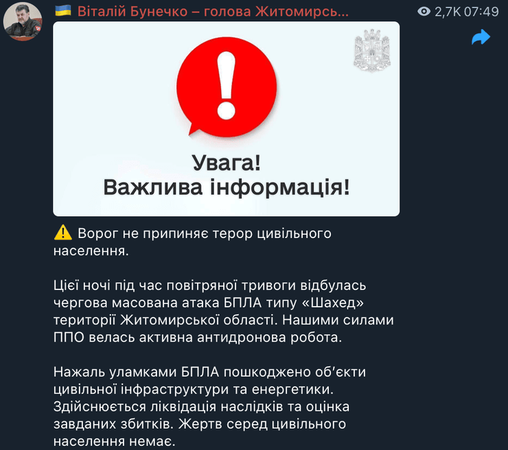 "Цієї ночі під час повітряної тривоги відбулась чергова масована атака БпЛА типу "Шахед" території Житомирської області. Нашими силами ППО велась активна антидронова робота", — сказав Віталій Бунечко.