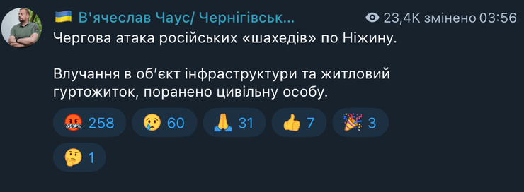 Вʼячеслав Чаус, голова Чернігівської ОВА, зауважив, що окупанти атакували Ніжин за допомогою БпЛА.