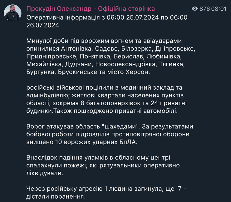 Голова Херсонської ОВА Олександр Прокудін повідомив, що окупанти атакували регіон за допомогою ударних дронів.