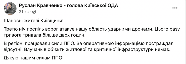 Керівник Київської ОВА Руслан Кравченко зазначив, що ЗС РФ атакують регіон третю ніч поспіль за допомогою ударних дронів.