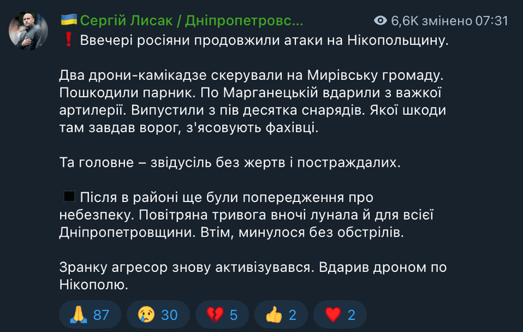 "Два дрони-камікадзе скерували на Мирівську громаду. Пошкодили парник. По Марганецькій вдарили з важкої артилерії. Випустили з пів десятка снарядів", — сказав Сергій Лисак.