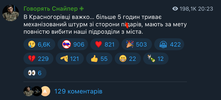 "П*дари намагаються дотискати Красногорівку, задіяли 16 одиниць бронетехніки для штурму наших позицій", — сказав він.