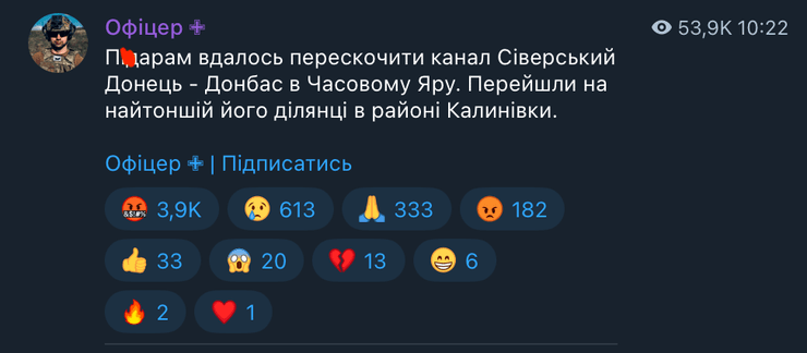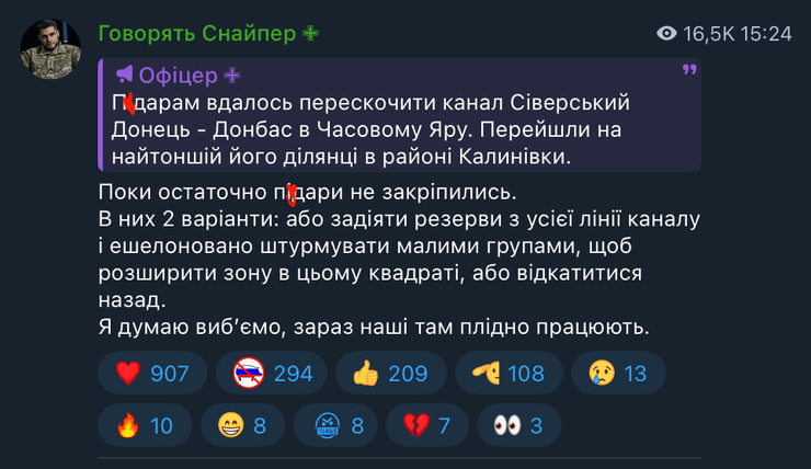 Збройні сили Російської Федерації перескочили канал Сіверський Донець–Донбас у Часовому Яру Донецької області. Про це повідомив офіцер ЗСУ з позивним "Алекс" у своєму Telegram-каналі.