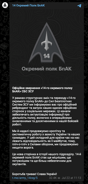 "У межах структурних змін та переходу "14-го окремого полку БпАК" до Сил Безпілотних Систем ЗСУ ми інформуємо вас про офіційний ребрендинг та запуск наших єдиних офіційних сторінок у соціальних мережах", — йдеться у повідомленні.