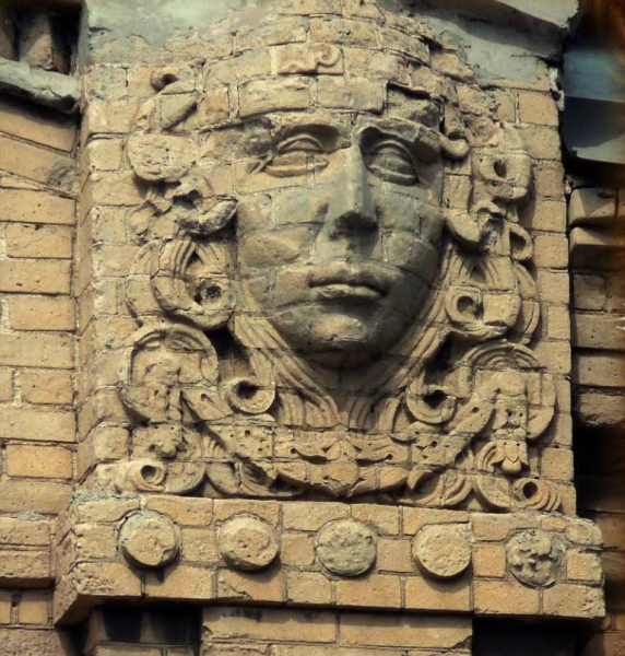 Зазначається, що культурна пам'ятка була розташована на будинку купця Рябінкіна, який побудували ще у ХІХ столітті, за адресою Георгіївська, 11. Там російські робітники затинькували унікальні цегляні маскарони.