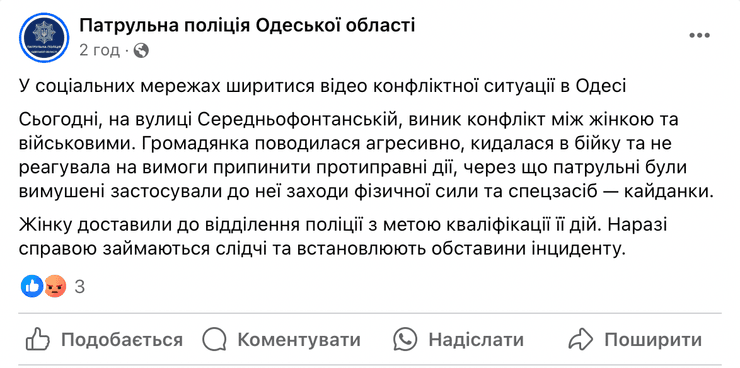 "У соціальних мережах ширитися відео конфліктної ситуації в Одесі. Сьогодні на вулиці Середньофонтанській виник конфлікт між жінкою та військовими. Громадянка поводилася агресивно, кидалася в бійку та не реагувала на вимоги припинити протиправні дії", — йдеться у повідомленні.