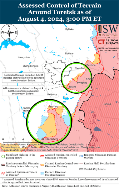 Як зазначають аналітики з посиланням на російських військових блогерів, ЗС РФ просунулися до кілометра на захід від Залізного (на південний схід від Торецька) і вийшли на адміністративні межі м. Торецьк, хоча ISW не знайшов підтвердження цих тверджень. Також 3 і 4 серпня російські війська продовжували наступальні дії в районі Торецька, а також на схід від міста в районі Північного, на в районі Залізного, Нью-Йорка та Пантелеймонівки.