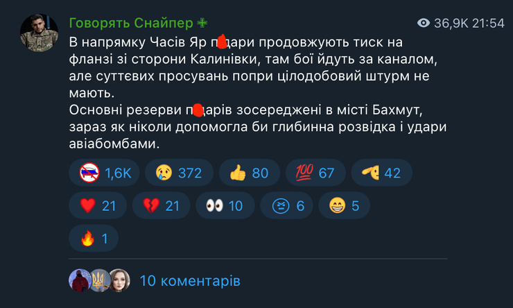 Підрозділи Збройних сил Російської Федерації тиснуть в напрямку Часового Яру Донецької області. Про це повідомив український військовослужбовець Станіслав Бунятов з позивним "Осман" у своєму Telegram-каналі 5 серпня.