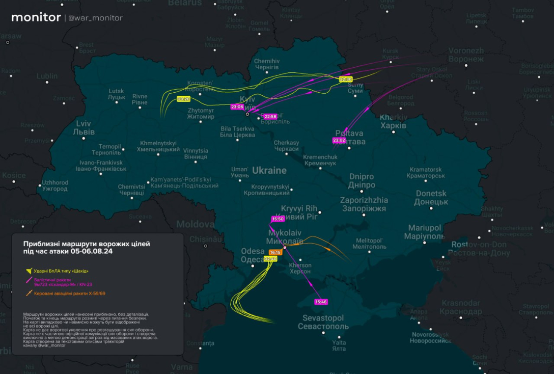 В ніч на 6 серпня росіяни запустили по Україні балістичні ракети "Іскандер-М"/KN-23, керовані авіаційні ракети Х-59 та БпЛА типу "Shahed". Канал моніторингу російської авіації опублікував траєкторії польоту ворожих засобів ураження.