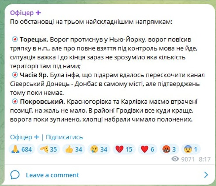 "Ворог протиснув у Нью-Йорку, ворог повісив тряпку в населеному пункті, але про повне взяття під контроль мова не йде, ситуація важка і до кінця зараз не зрозуміло яка кількість території там під нами", — написав "Алекс".