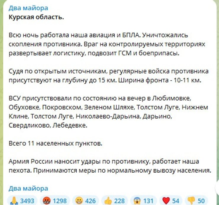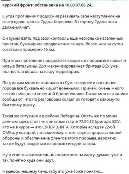 "Противник зумів взяти під свій контроль ще кілька населених пунктів. Сумарне просування трохи більше, ніж за добу склало приблизно 15 км. Водночас противник продовжує вводити у прорив все нові та нові батальйони. 22-а механізована бригада ЗСУ вже повністю увійшла на нашу територію. За даними моїх джерел із Сум, на північ і на схід від міста все буквально кишить військовими. Причому дуже багато легких пікапів та колісної бронетехніки. Також мої джерела повідомляють, що за розмовами солдатів їх готують до якогось швидкого ривка", — повідомив Подоляка.