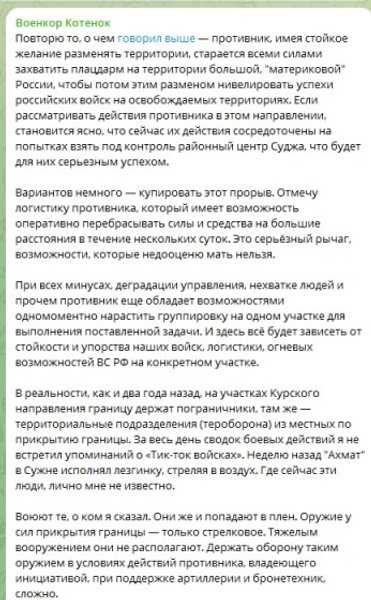 "Все залежатиме від стійкості та завзяття наших військ, логістики, вогневих можливостей ЗС РФ на конкретній ділянці. Насправді, як і два роки тому, на ділянках Курського спрямування кордон тримають прикордонники, там же — територіальні підрозділи (тероборона) із місцевих за прикриттям кордону. За весь день зведення бойових дій я не зустрів згадок про "Тік-Ток війська". Тиждень тому "Ахмат" у Сужні виконував лезгінку, стріляючи у повітря. Де зараз ці люди особисто мені не відомо", — написав Котенок.