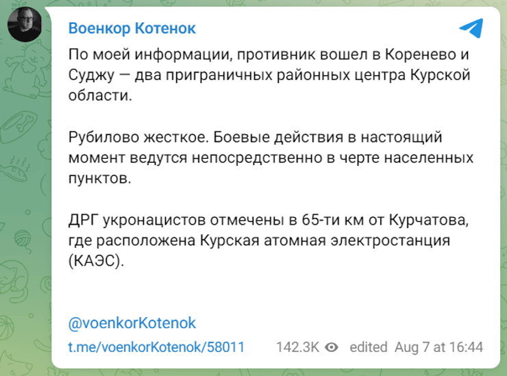 Журналіст-пропагандист Юрій Котьонок заявив про ведення бойових дій безпосередньо в межах населених пунктів Коренево і Суджа. Він зазначив, що українські "ДРГ" перебувають за 65 км від Курської АЕС.
