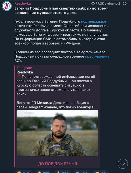 У ворожому Telegram-каналі Readovka розповіли, що військкора нібито було ліквідовано під час виконання "службового обовʼязку" в Курській області.