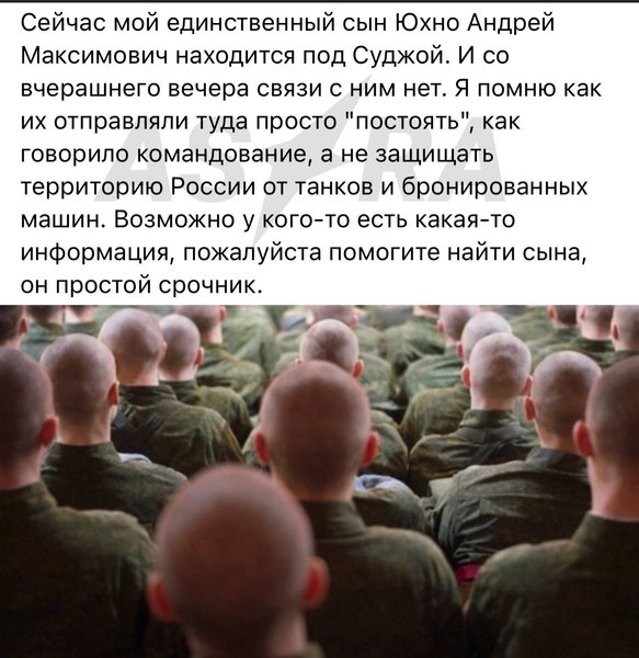 "Зараз мій єдиний син Юхно Андрій Максимович перебуває під Суджею. І зі вчорашнього вечора зв'язку з ним немає. Я пам'ятаю, як їх відправляли туди просто "постояти", як говорило командування, а не захищати територію Росії від танків та броньованих машин", — написала росіянка Вікторія Юхно в "ВКонтакте".