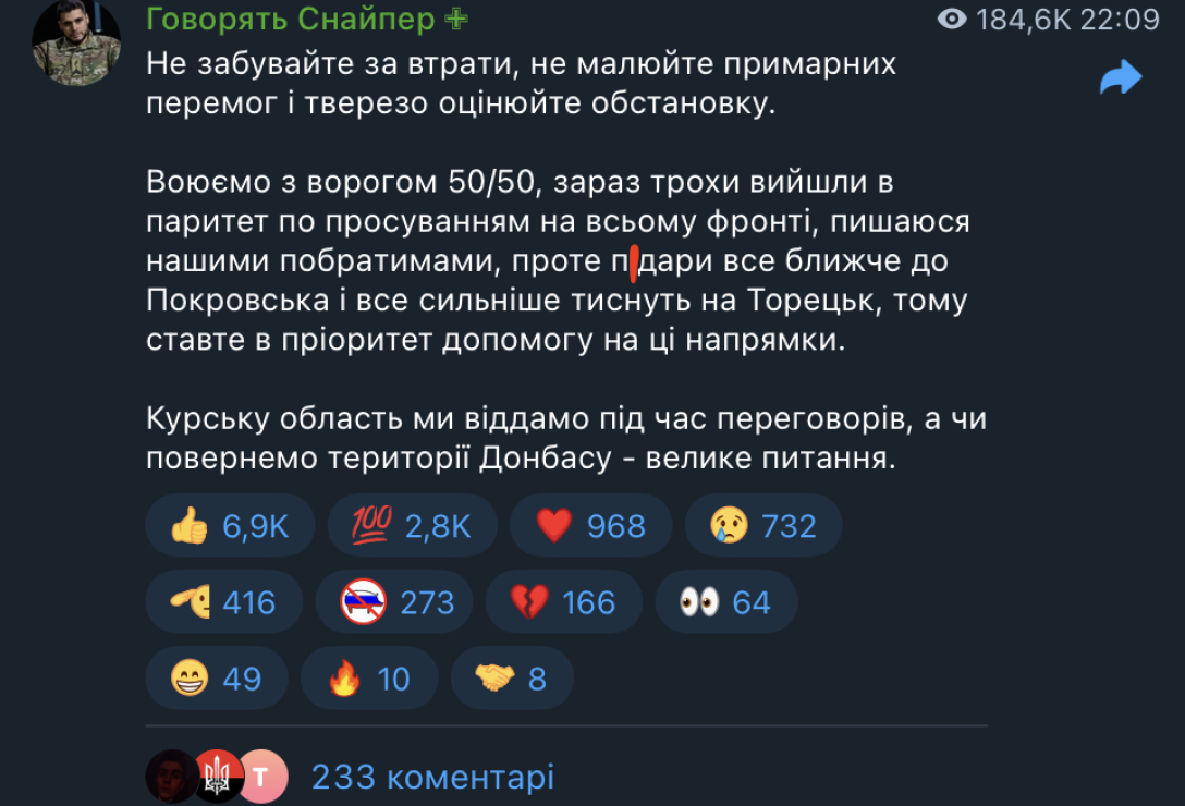 "Воюємо з ворогом 50/50, зараз трохи вийшли в паритет по просуванням на всьому фронті, пишаюся нашими побратимами, проте п*дари все ближче до Покровська і все сильніше тиснуть на Торецьк, тому ставте в пріоритет допомогу на ці напрямки", — пояснив він.