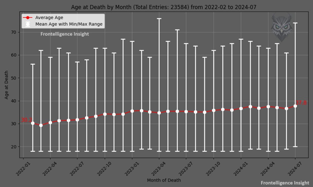 Проаналізувавши набір даних із 23 548 записів із російських некрологів у соціальних мережах, виявилося, що в період із лютого 2022 року по травень 2024 року середній вік російських солдатів, загиблих у боях, збільшився з 30,2 років на початку 2022 року до 37,8 років до липня 2024 року.