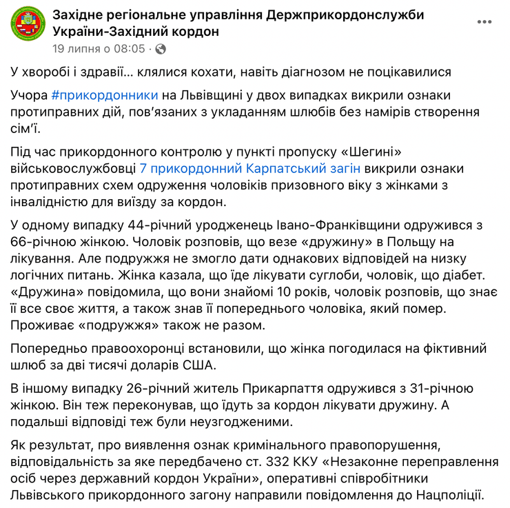 У липні було виявлено два подібні випадки. Так, в одному випадку 44-річний уродженець Івано-Франківщини одружився з 66-річною жінкою. Він розповів прикордонникам, що нібито везе дружину в Польщу на лікування. Проте подружжя не змогло дати однакові відповіді на низку логічних питань. А саме жінка сказала, що їде лікувати суглоби, а чоловік розповідав про діабет. Також жінка розповіла, що знає чоловіка десять років, а той сказав — "усе своє життя", пара проживала не разом.