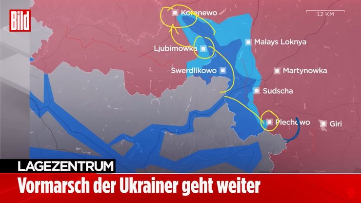 За словами аналітика BILD з аналізу відкритих даних Юліана Рьопке, на північ від міста Суджа ЗСУ наступають на райцентр Коренево. Зараз вони вже підійшли до цього населеного пункту, який має свою залізничну станцію.