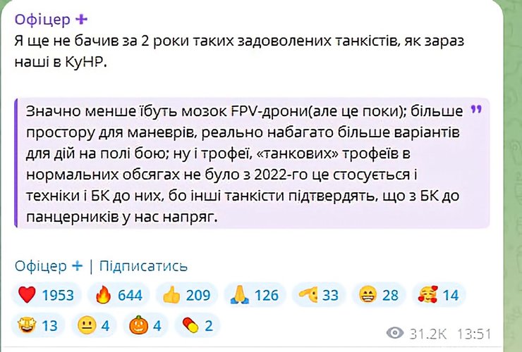 "Значно менше **уть мозок FPV-дрони (але це поки), більше простору для маневрів, реально набагато більше варіантів для дій на полі бою, ну і трофеї, "танкових" трофеїв в нормальних обсягах не було з 2022-го. Це стосується і техніки і БК до них, бо інші танкісти підтвердять, що з БК до панцерників у нас напряг", — розповіли бійці.