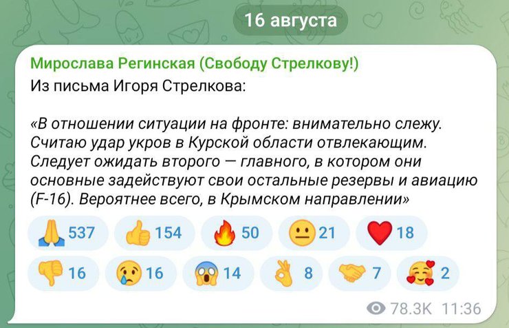 "Щодо ситуації на фронті: уважно стежу. Вважаю удар укрів у Курській області відволікаючим. Слід очікувати іншого — головного, в якому вони залучають основні інші резерви та авіацію (F-16). Найімовірніше, у Кримському напрямку", — написав Гіркін.