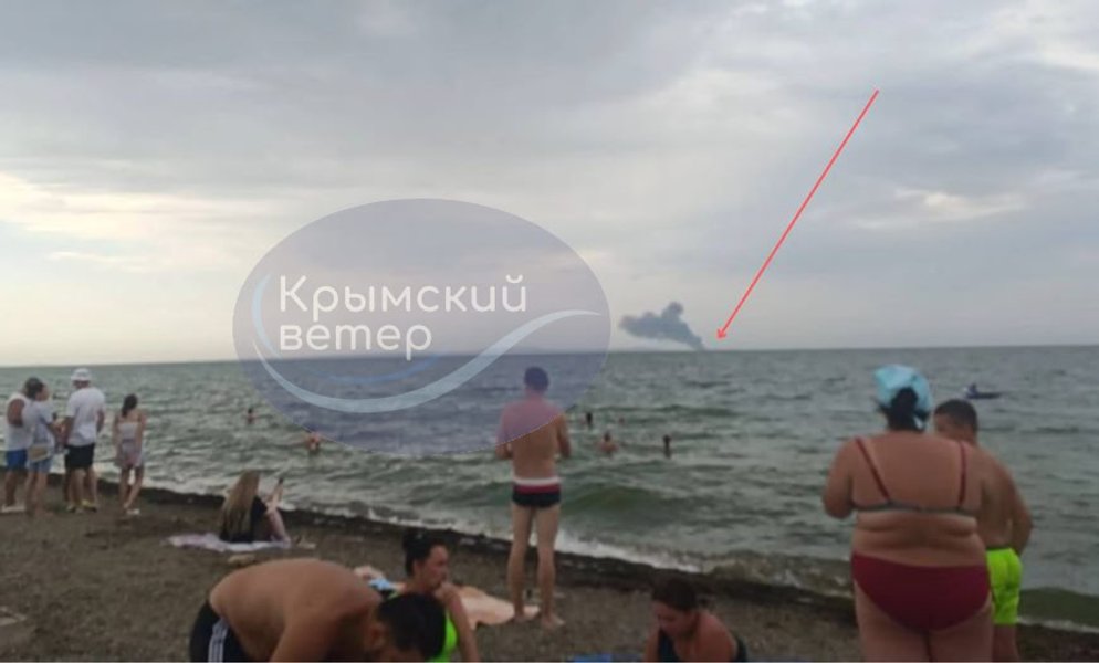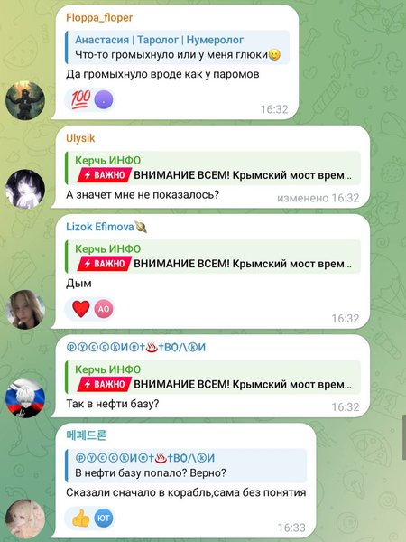 "З Керчі нам повідомляють, що у порту "Кавказ" українською ракетою підірвано пором. Судячи з диму, можемо припустити, що на поромі були цистерни з пальним", — йдеться в повідомленні.