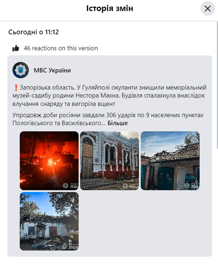 У повідомленні пресслужба МВС зазначала, що загарбники знищили меморіальний музей-садибу родини Нестора Махна, однак згодом правоохоронці відредагували публікацію.