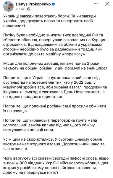 "У сьогоднішньому обміні вкотре немає жодного азовця. Дорогоцінний шанс та час втрачені. Чого вартують всі сказані сьогодні пафосні слова, якщо з-поміж 900 відданих Україні військовослужбовців, до котрих у російському полоні найгірше ставлення, додому не повернувся ніхто?", — задався питанням командир "Азову".