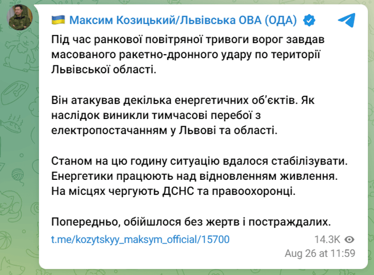 "Ворог атакував енергетичні об'єкти на Львівщині. Через це у Львові та області частково виникли перебої з електропостачанням. Деталі згодом", — зазначив Козицький о 09:38.