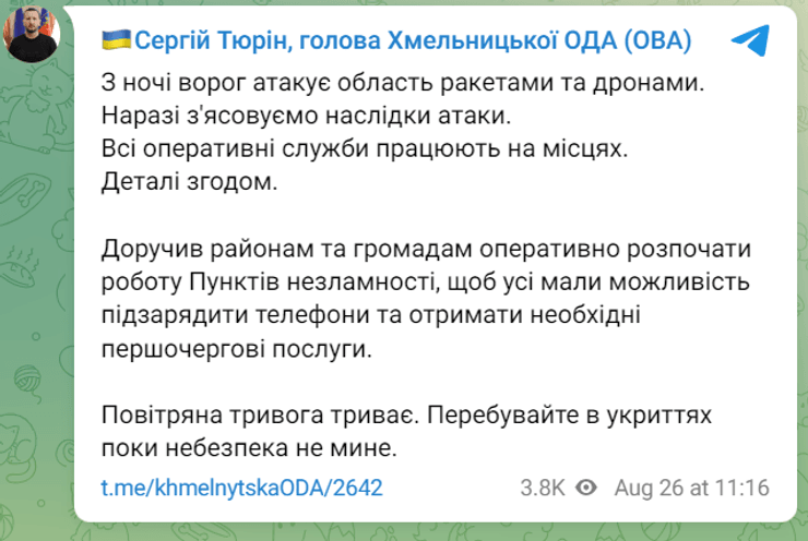 Обстріл України 26 серпня — удар по Хмельницькій області