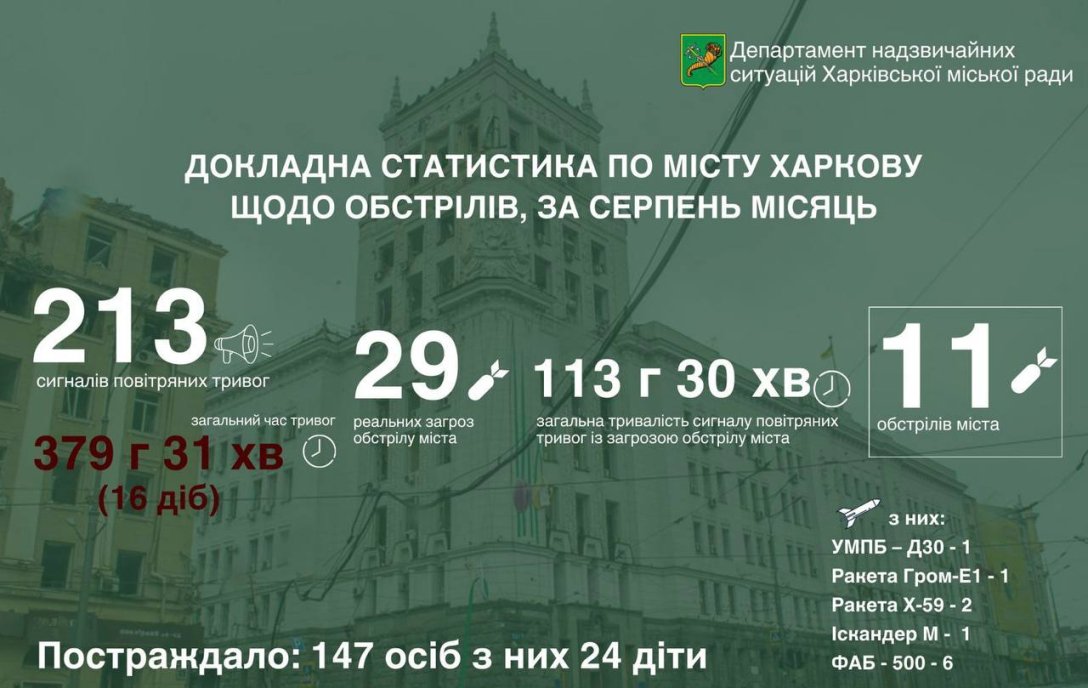 На опублікованій ним інфографіці можна детальніше побачити, як противник тероризував місті протягом місяця. Реальних загроз обстрілів Харкова в серпні було зафіксовано 29 і з них росіяни 11 разів атакували східне місто.