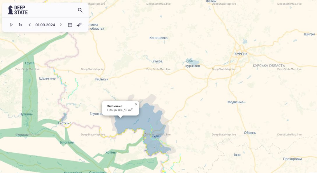 Зазначимо, наступ ЗСУ в Курській області почався 6 серпня і триває майже місяць. Згідно з одним із останніх звітів головнокомандувача ЗСУ Олександра Сирського, Україна контролює 1 250 кв. км російської території і 95 населених пунктів. На карті DeepState бачимо, що місцевість, де точаться бої, простягається по обидва боки від міста Суджа. Також є плацдарм площею 11,35 кв. км біля села Тьоткине.