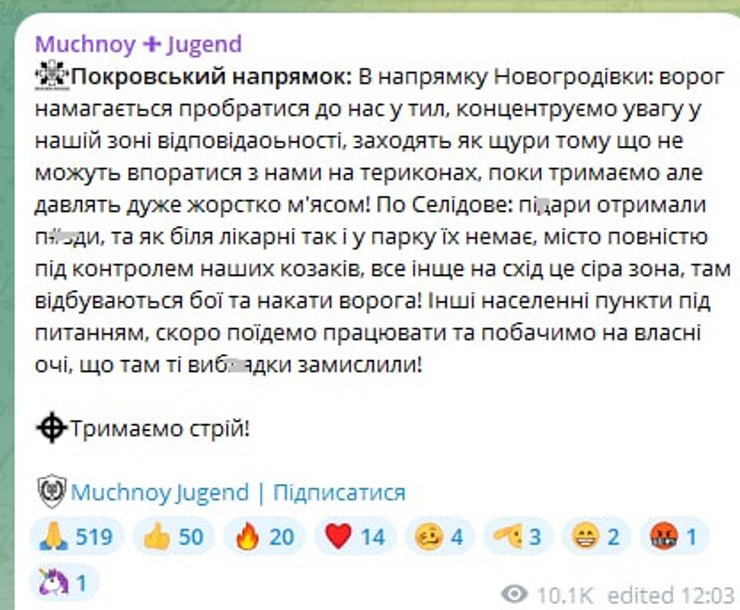 "По Селидовому: п**ари отримали п**ди, як біля лікарні, так і у парку їх немає, місто повністю під контролем наших козаків, все інще на схід — це сіра зона, там відбуваються бої та накати ворога", — розповів він.