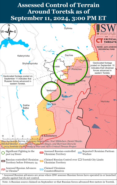 Також, за словами аналітиків, 10 і 11 вересня російські сили продовжили наземні атаки в районі Дачного (на північний схід від Торецька), Північного (східна частина від Торецька) і Неліпівки (південь Торецька).
