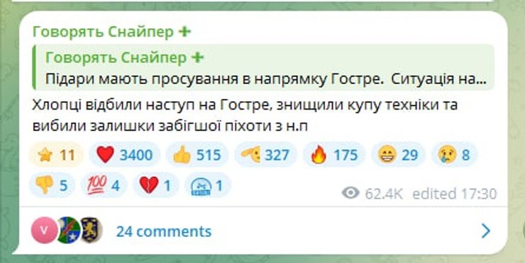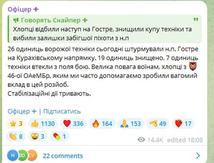 "Хлопці відбили наступ на Гостре, знищили купу техніки та вибили залишки піхоти, яка забігла, з населеного пункту", — проінформував він.
