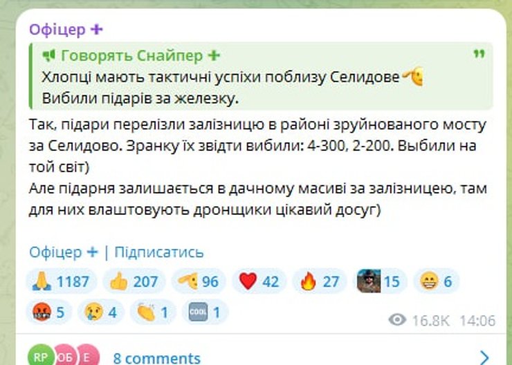 "Так, п**ари перелізли через залізницю в районі зруйнованого мосту за Селидовим. Зранку їх звідти вибили: 4 — 300, 2 — 200. Вибили на той світ", — проінформував він.