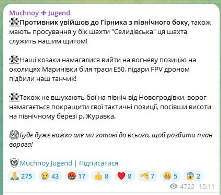 "Наші козаки намагалися вийти на вогневу позицію на околицях Маринівки біля траси Е50, п**ари FPV-дроном підбили наш танчик. Також не вщухають бої на північ від Новогродівки, ворог намагається покращити свої тактичні позиції, посівши висоти на північному березі річки Журавка", — написав він.
